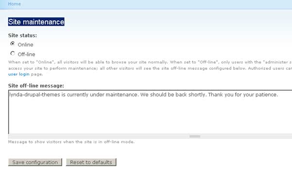 Membuat situs dalam status offline dapat di lakukan dengan merubah konfigurasi di admin -> Site Configuration -> Site maintenance. Dengan memilih Site status menjadi off-line maka situs akan berada dalam status offline.